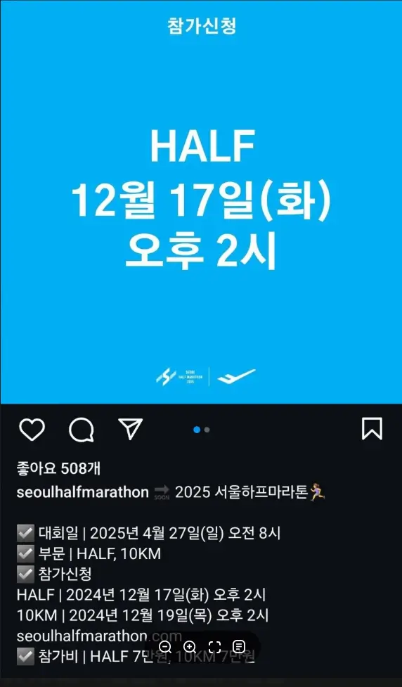 하프는 12월 7일 오후 2시, 10km는 12월 19일 오후 2시에 오픈해요. 작년에는 추가 접수까지 진행되었지만, 올해는 어떨지 모르니 미리미리 준비하는 게 좋겠죠?